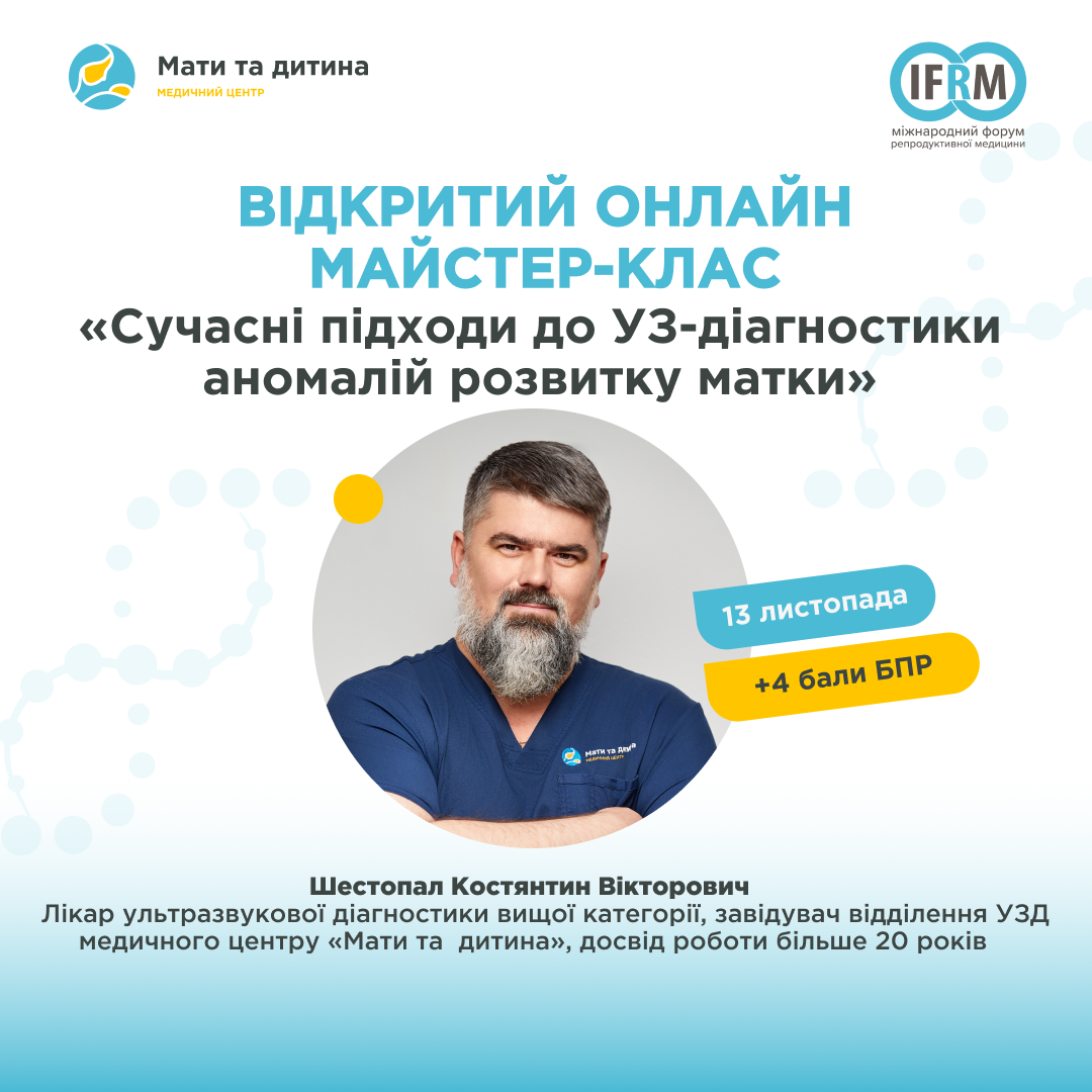 13 Листопада @ 3:00 pm - 5:00 pm Майстер-клас «Сучасні підходи до УЗ-діагностики аномалій розвитку матки у жінок репродуктивного віку» Зареєструватись